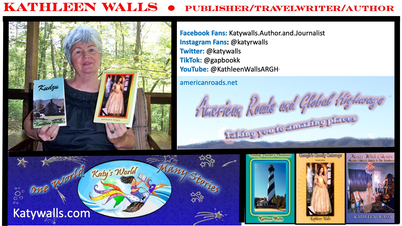 Today our guest for a Halloween/Day of the Dead discussion of ghost stories around the American south, is Author, travel writer, and publisher Kathleen “Katy” Walls a former reporter for Union Sentinel in Blairsville, GA, and publisher/writer for American Roads and Global Highways. She currently resides in Middleburg, FL, and has lived in Florida most of her life but travels extensively, mainly in the Southeast. Kathleen was born in New Orleans and goes back often to Louisiana. She has lived in Mississippi and Georgia as well. She is the author of travel books: Georgia’s Ghostly Getaways, Finding Florida’s Phantoms, Hosts With Ghosts, and Wild About Florida series, novels; Last Step, Kudzu, Under a Bloody Flag, Under a Black Flag, For Want of a Ship, The Tenant From Hell, Double Duplicity, and The Ranch House Heist, True Crime; ManHunt: The Eric Rudolph Story, and Missing but not Forgotten (This one is slightly fictionalized but based on a true abduction case in a tiny Florida town. The case has never been solved.) The print ones are available on her site, Katy’s World. The ebooks are available from Amazon. She is currently working on American Music: Born in the USA: A History of American Music. Since it’s going to include places about music as well as people, it’s taking her to visit some interesting music related spots. Her travel site is American Roads and Global Highways (americanroads.net). Other publications she writes for include Roadtrippers, World Footprints, Snowbirds and RV Travelers, Family RVing, Deep South, Florida Country, Rovology, Extended Weekend Getaways, She Buys Travel, and more. She’s a proud member of International Food, Wine, and Travel Writers (IFWTA) and Society of American Travel Writers (SATW).